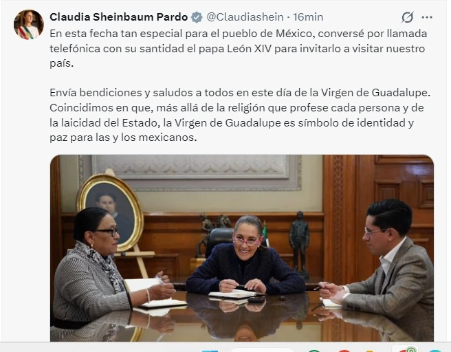 La presidenta Claudia Sheinbaum Pardo habló vía telefónica con el papa León XIV para invitarlo a visitar México, dio a conocer este viernes, día de la Virgen de Guadalupe, a través de redes sociales.