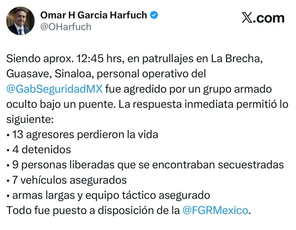 El secretario de Seguridad y Protección Ciudadana, Omar García Harfuch, informó que personal del Gabinete de Seguridad fue agredido por un grupo armado alrededor de las 12:45 horas de este lunes, mientras realizaba patrullajes en el poblado de La Brecha, municipio de Guasave, Sinaloa.