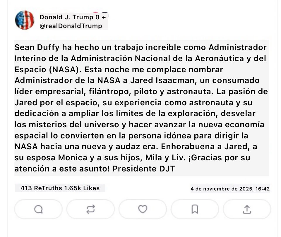 El presidente de Estados Unidos, Donald Trump, volvió a nominar al empresario y piloto Jared Isaacman, ligado a SpaceX, como nuevo encargado de la Administración Nacional de la Aeronáutica y del Espacio, la NASA, cinco meses después de retirar su candidatura por diferencias con Elon Musk.