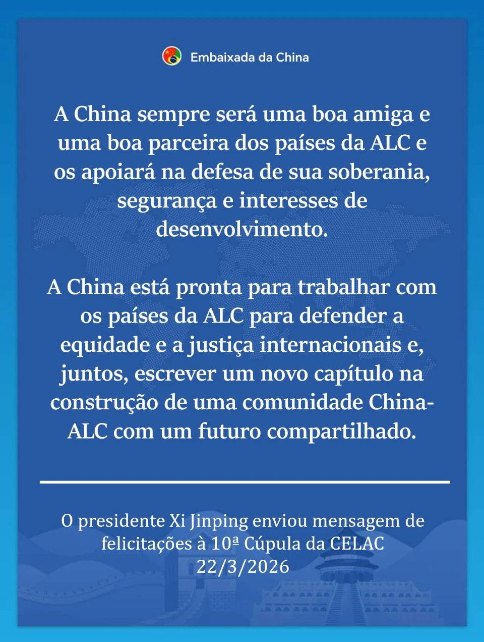 El presidente de China, Xi Jinping, afirmó que su país “siempre será un buen amigo y socio” de América Latina y el Caribe, al enviar un mensaje a la Décima Cumbre de la Comunidad de Estados Latinoamericanos y Caribeños (CELAC), celebrada en Bogotá, Colombia.